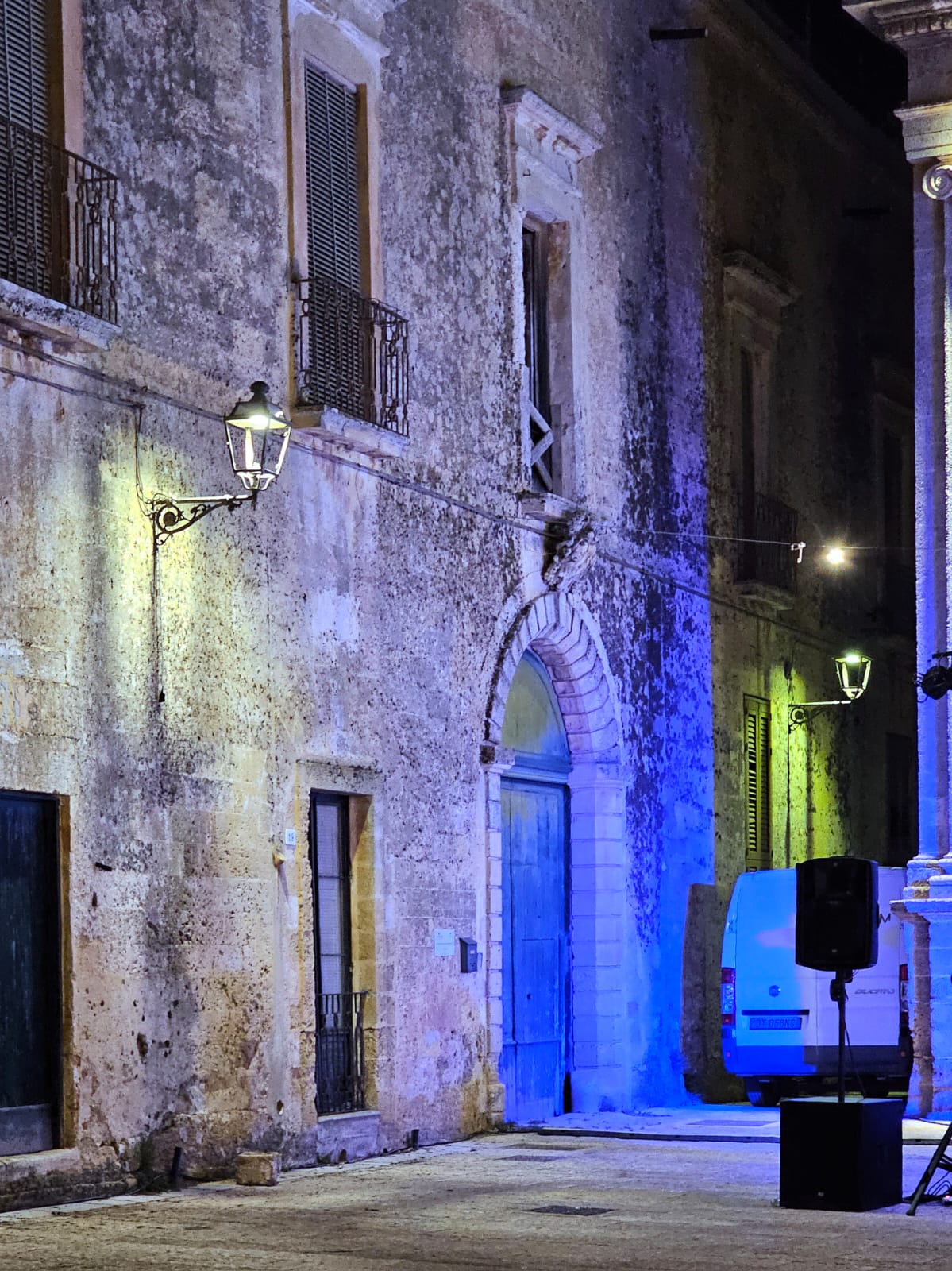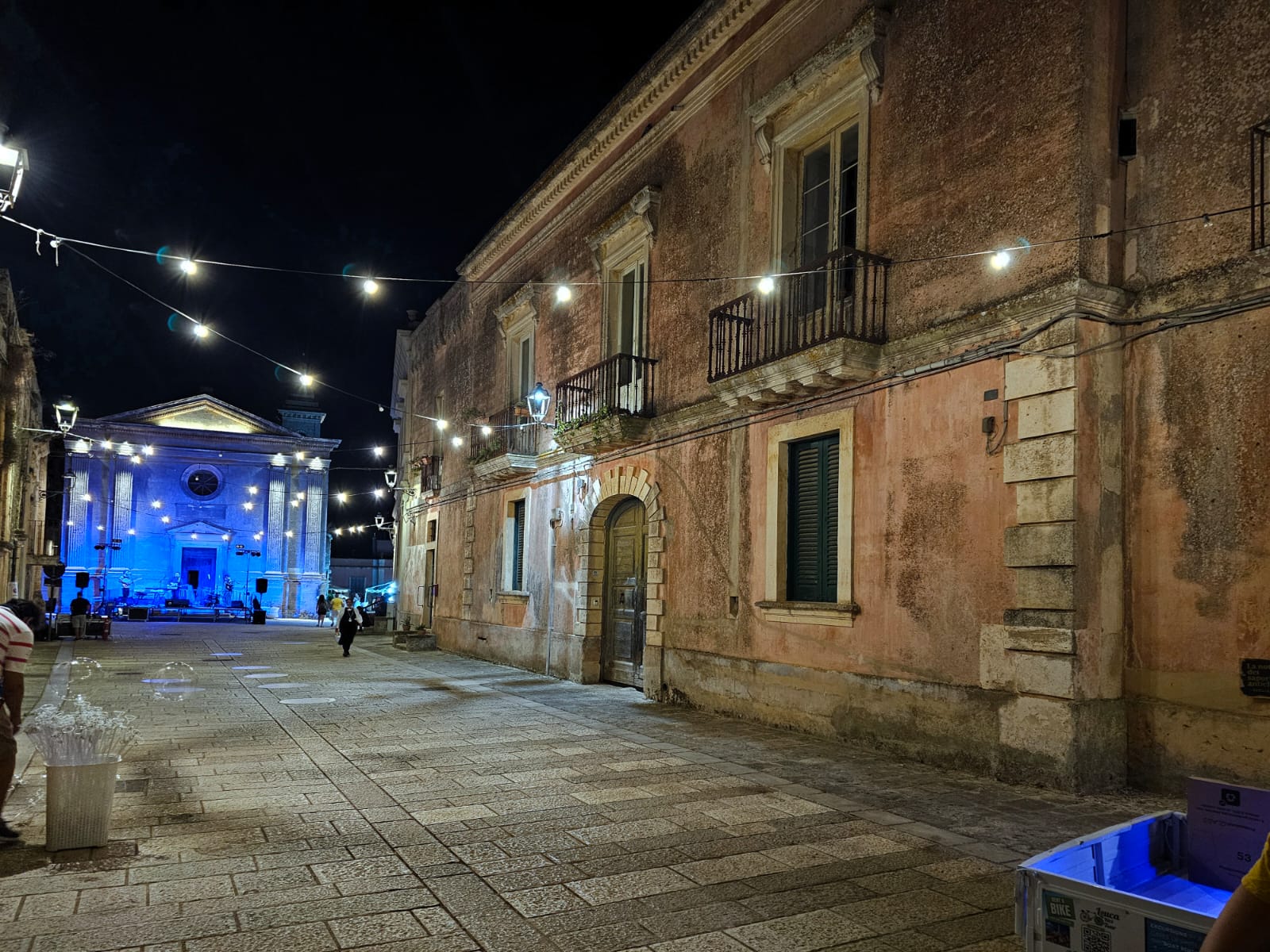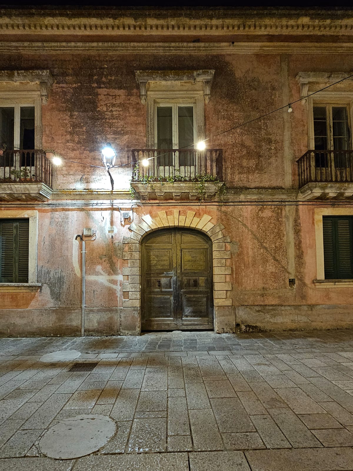 Questa piazza conserva innegabilmente la magnificenza di un tempo lontano, per i palazzi che ne disegnano i contorni, per il colore sbiadito delle facciate, per il linguaggio muto delle finestre , dei portoni, delle lesene che ne rafforzano le linee geometriche. I colori riflettono le luci discrete della sera di festa.